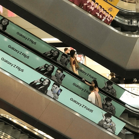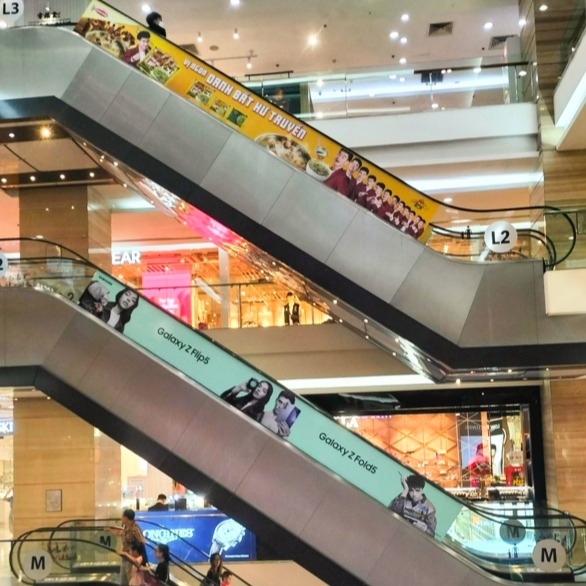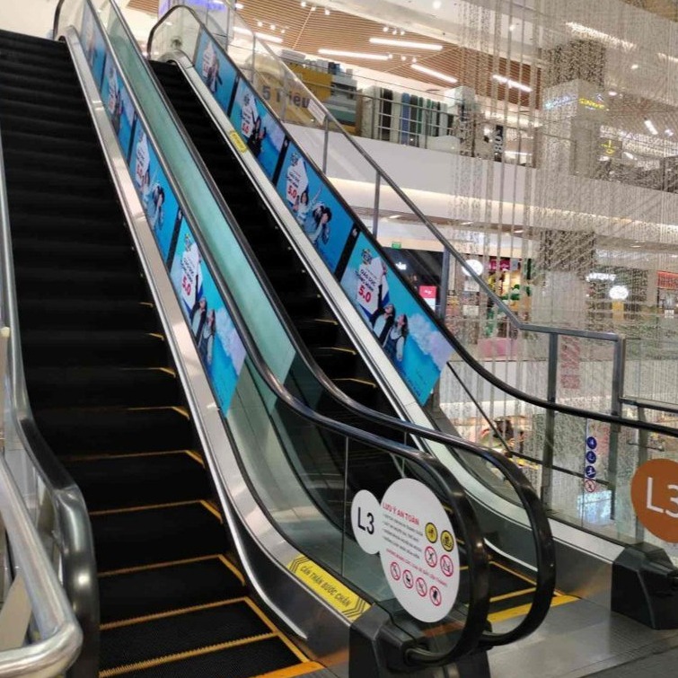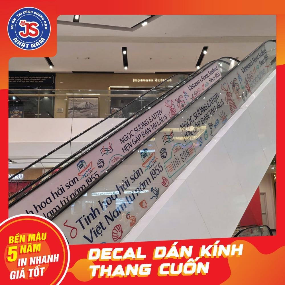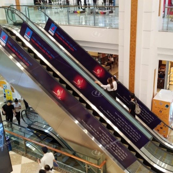Đây là loại decal chuyên dụng được in bằng công nghệ UV và dán trực tiếp lên bề mặt thang cuốn (bậc thang hoặc vách hông). Hình ảnh được căn chỉnh liên tục theo từng bậc, tạo hiệu ứng chuyển động bắt mắt khi thang hoạt động.