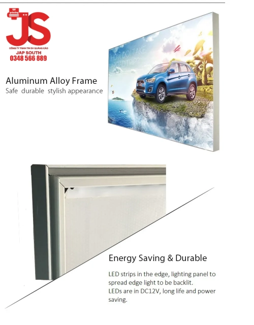Điểm nổi bật của hộp đèn vải chính là tính thẩm mỹ cao, độ sắc nét vượt trội và dễ dàng thay đổi nội dung mà không phải tháo toàn bộ cấu trúc khung. Khung hộp đèn thường được làm bằng nhôm chuyên dụng, chắc chắn, trọng lượng nhẹ và không gỉ.
