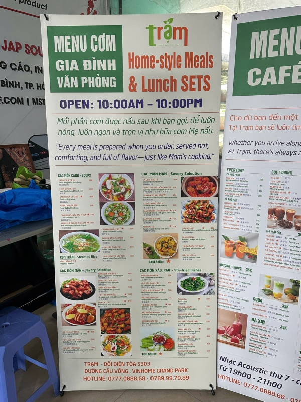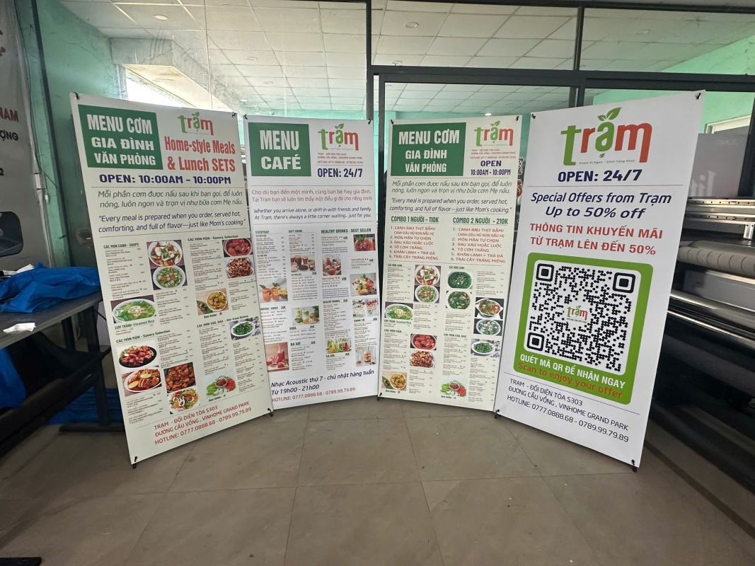 Trong môi trường kinh doanh ẩm thực sôi động tại khu ẩm thực Trạm – Food Court thuộc Vinhomes Grand Park, việc tạo sự khác biệt để thu hút khách hàng là yếu tố sống còn. Hàng chục gian hàng cạnh tranh trực tiếp khiến khách hàng chỉ mất vài giây để quyết định dừng lại hay bỏ qua. Chính vì vậy, các công cụ quảng cáo trực quan như standee in UV PP đế xám kèm chân X đang trở thành “vũ khí” marketing hiệu quả, chi phí hợp lý nhưng mang lại giá trị lâu dài.