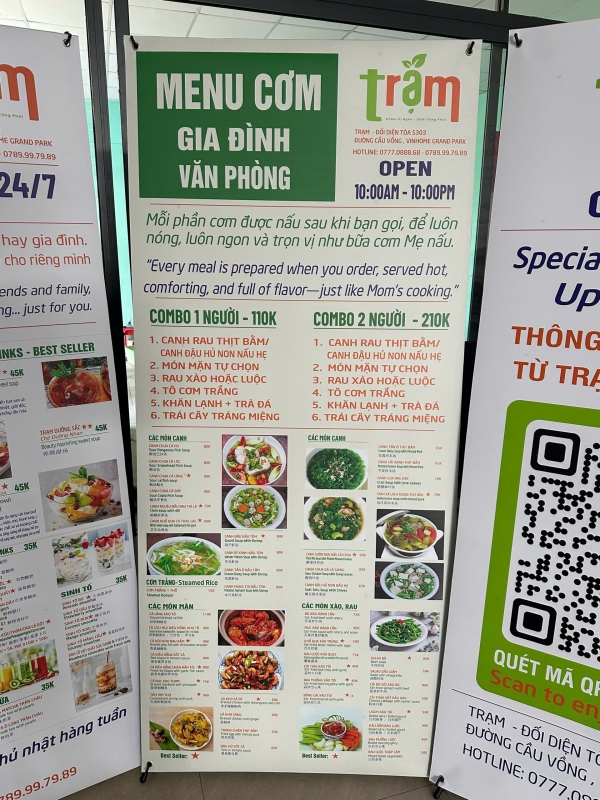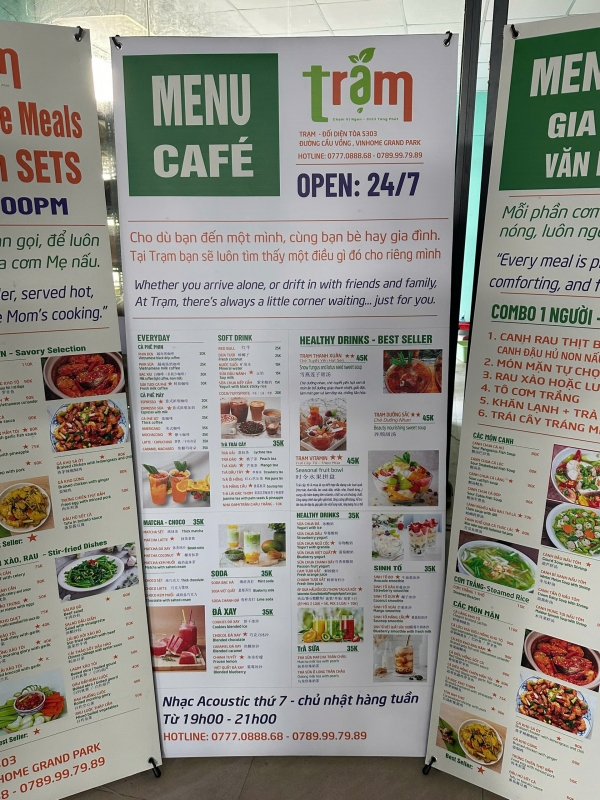 Tại khu ẩm thực Trạm – Food Court ở Vinhomes Grand Park, standee PP đế xám in UV được sử dụng rộng rãi: