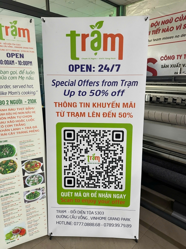 In UV standee PP đế xám kèm chân X không chỉ là một sản phẩm in ấn mà còn là giải pháp marketing hiệu quả cho các gian hàng tại khu ẩm thực Trạm – Food Court Vinhomes Grand Park.
